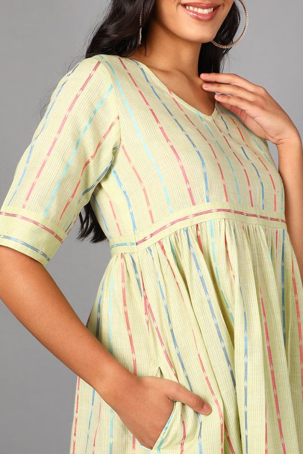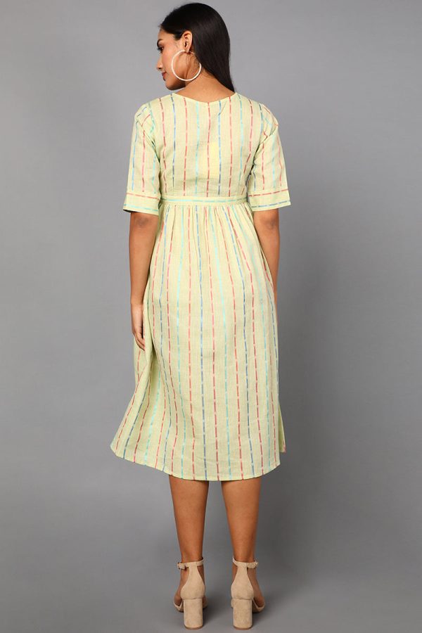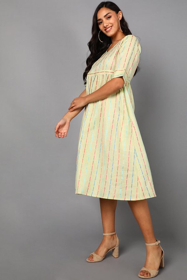 Cream cotton flared A-line dress, round neck with short sleeves, midi length inflated hem.