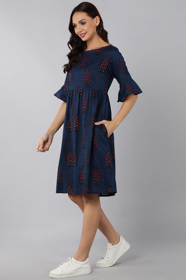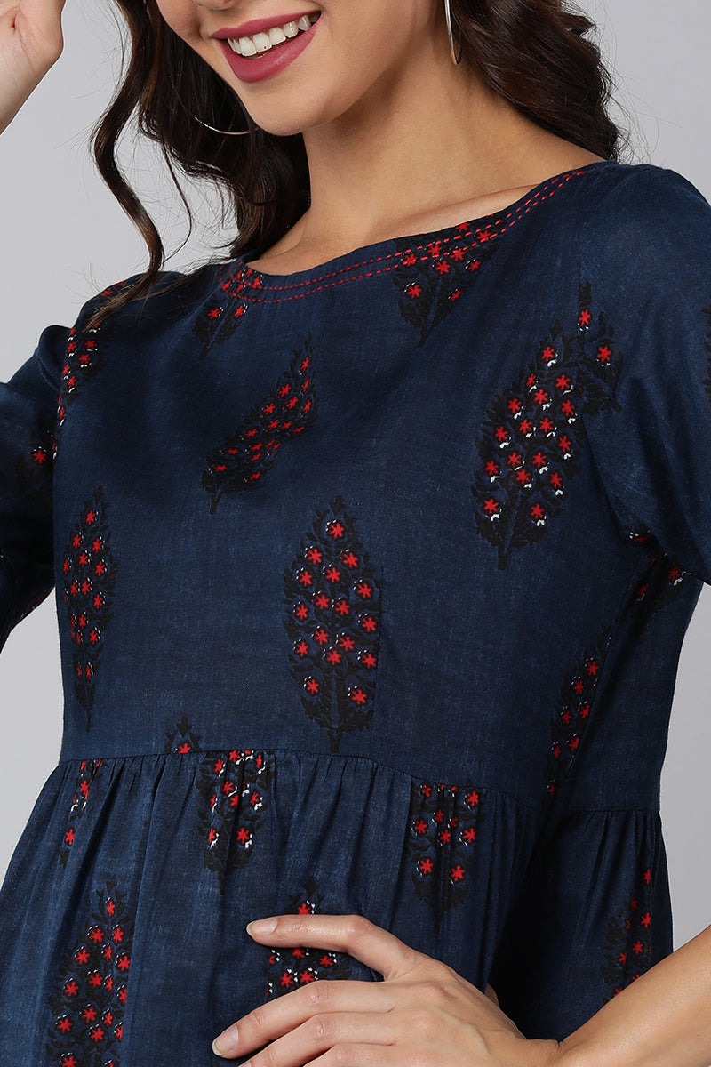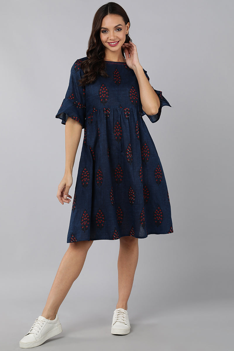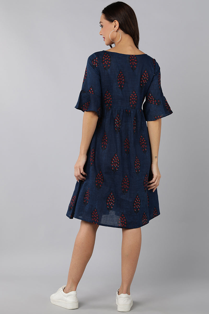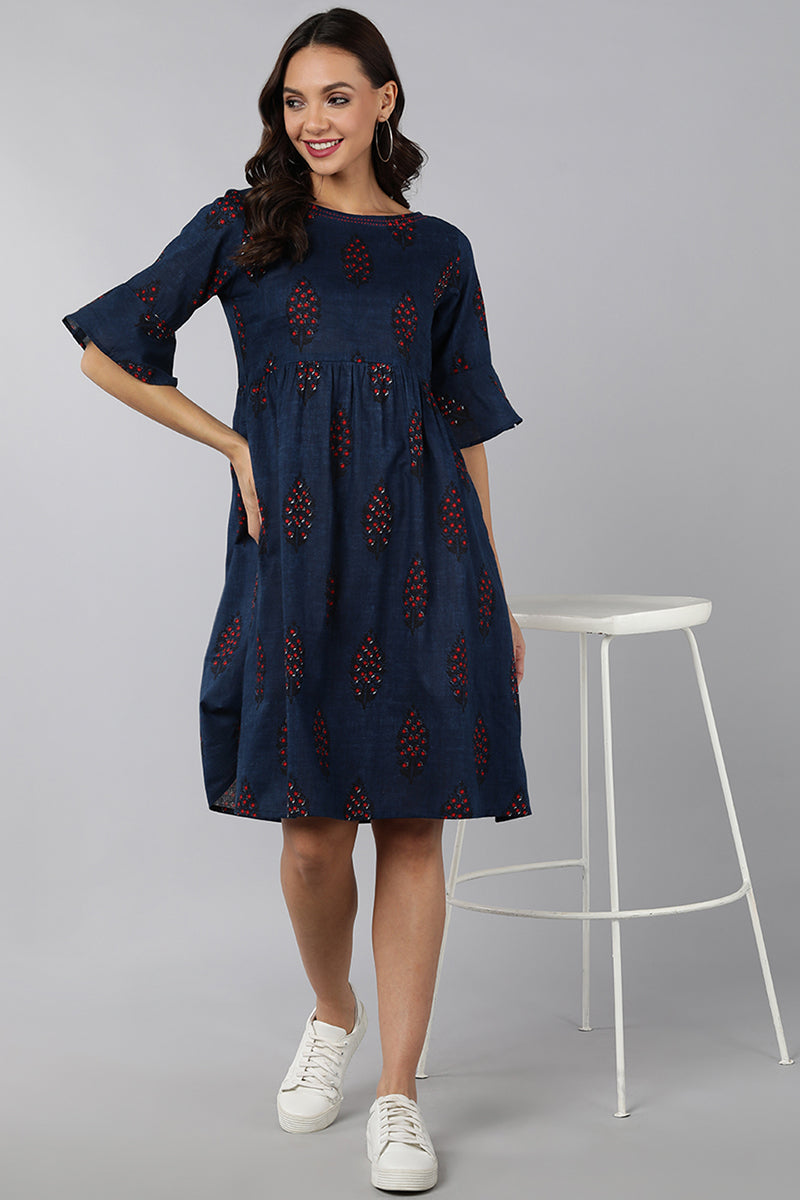 Navy Blue Cotton Ethnic Motifs Midi Dress